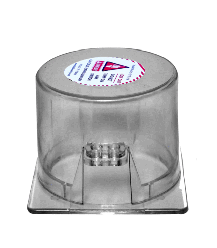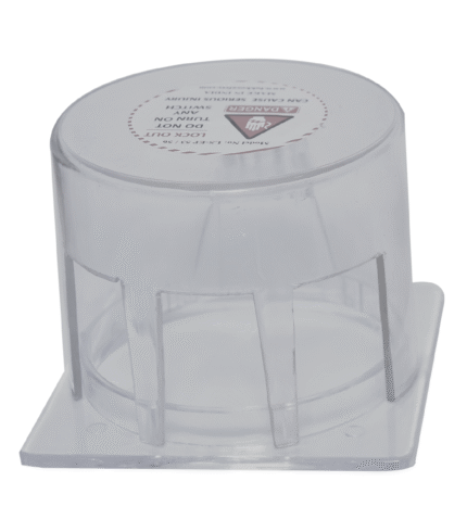 Transparent polycarbonate electrical panel lockout cover for push buttons and rotary switches, designed to fully enclose the control and accept a safety padlock so the switch cannot be operated during LOTO.