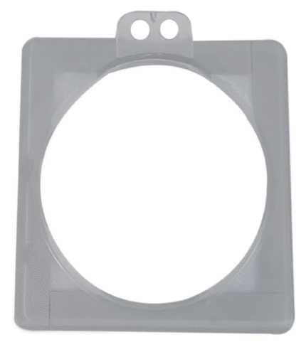 Transparent polycarbonate push button lockout box with hinged lid and retaining chain, designed to fully cover an emergency stop or control push button to prevent accidental or unauthorized operation while keeping it visible.