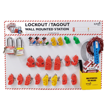 Lockout Tagout Dojo Board is a 6 ft × 4 ft wall‑mounted LOTO training and storage board that visually displays electrical and mechanical lockout devices with printed safe‑LOTO procedures for hands‑on learning and compliance.