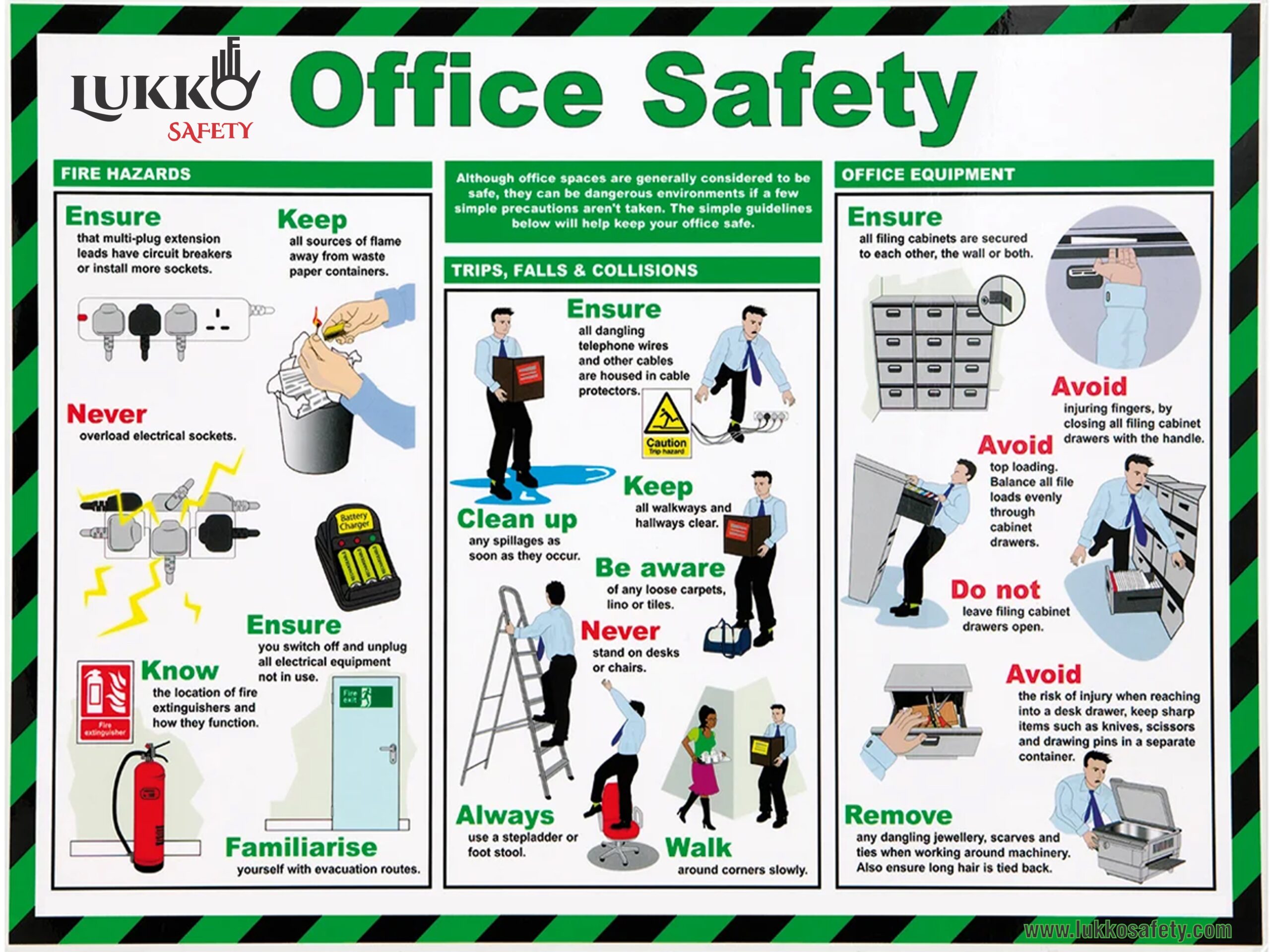 This Office Safety poster explains key safety precautions for office environments, covering fire hazards, trips/falls/collisions, and safe use of office equipment to reduce everyday workplace accidents.
