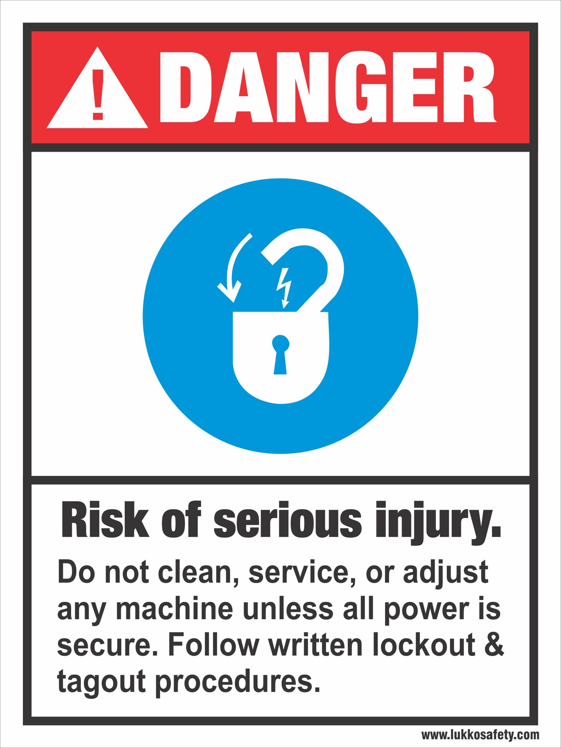This is an OSHA‑style DANGER – Risk of serious injury lockout/tagout warning sign that instructs workers not to clean, service, or adjust any machine until all power sources are isolated and secured and written LOTO procedures are followed, helping prevent injuries from unexpected energization or release of hazardous energy.