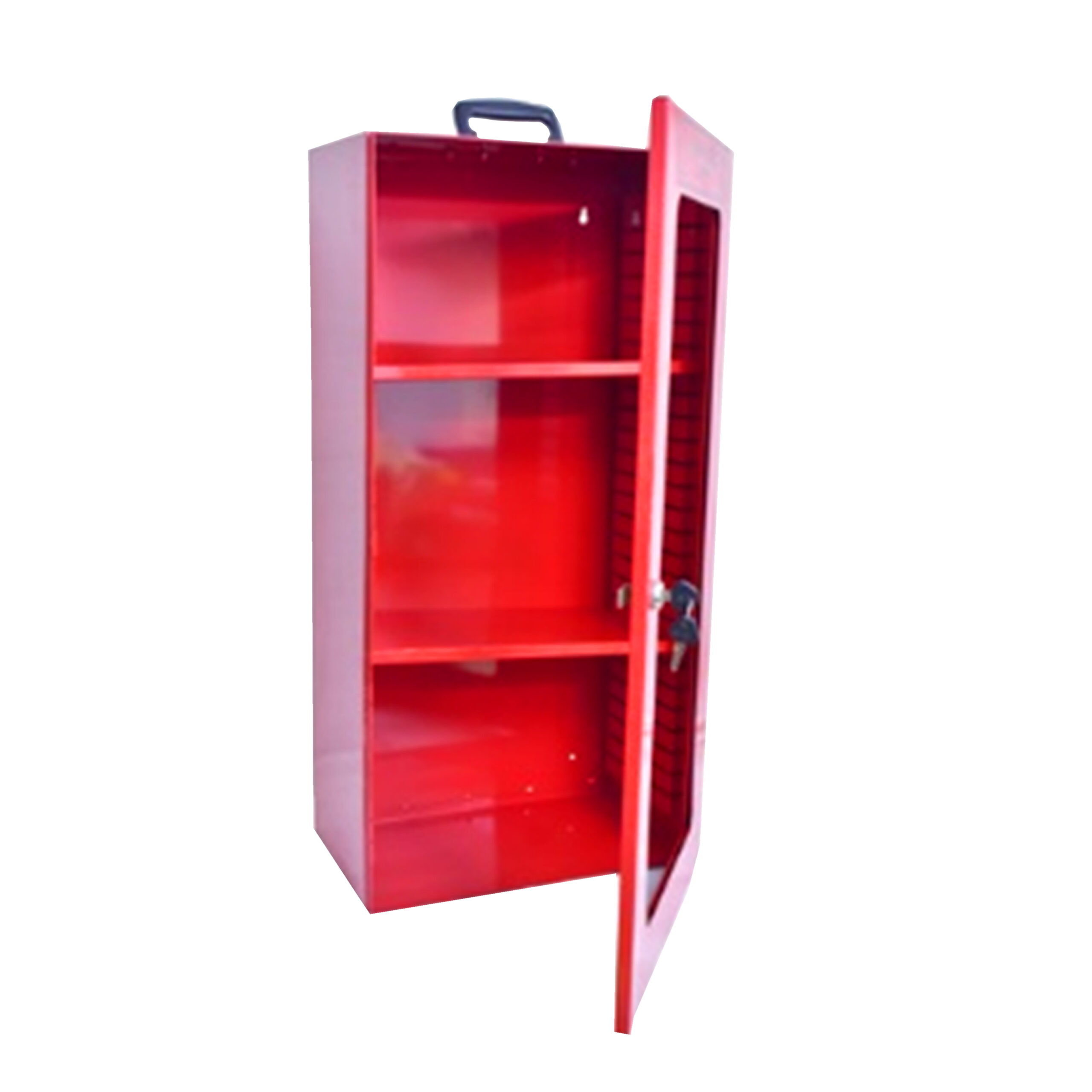 Powder coated Lock box suitable for wall fixing or use as a mobile unit. Available with hooks / interior racks / transparent window / clear fascia / fully closed door, Handle at the top to carry the box, One knob and one lock